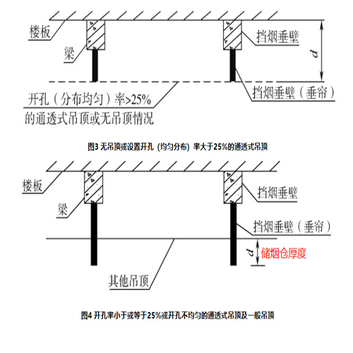 2.擋煙垂壁等擋煙分隔設(shè)施的深度≥規(guī)定的儲(chǔ)煙倉(cāng)厚度。對(duì)于有吊頂?shù)目臻g,當(dāng)?shù)蹴旈_孔不均勻或開孔率≤25%時(shí),吊頂內(nèi)空間高度不得計(jì)入儲(chǔ)煙倉(cāng)厚度。