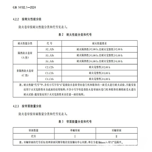 而今年4月29日發(fā)布的國家標準《防火卷簾 第1部分:通用技術條件》(GB14102.1-2024)則正式刪除了防火卷簾產(chǎn)品分類中側向卷和水平卷類別,這意味著防火卷簾的啟閉只有垂直卷這一個類別;同時,該標準還規(guī)定防火卷簾主要按照耐火性能和簾面數(shù)量進行分類,耐火性能分類由9類簡化為2類6級(隔熱防火卷簾和非隔熱防火卷簾),簾面數(shù)量分為單幅簾面和雙幅簾面,具體如下: