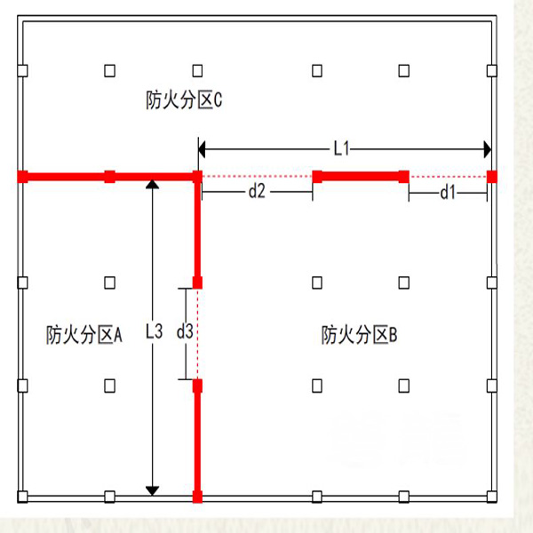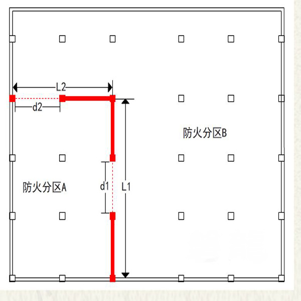 如上圖所示不管2個(gè)相鄰防火分區(qū)之間分隔的形狀如何,其分隔部分寬度均為所有距離相加,即L1和L2相加,其防火卷簾寬度也是d2和d1相加計(jì)算后滿足規(guī)范要求。