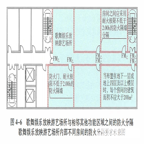 4.3.7 歌舞娛樂(lè)放映游藝場(chǎng)所的布置和分隔應(yīng)符合下列規(guī)定:3 房間之間應(yīng)采用耐火極限不低于2.00h的防火隔墻分隔;4 與建筑的其他部位之間應(yīng)采用防火門、耐火極限不低于2.00h的防火隔墻和耐火極限不低于1.00h的不燃性樓板分隔。