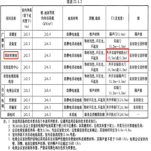 1各類機(jī)房的室內(nèi)凈高、荷載及地面、門窗等要求,應(yīng)符合表23.4.2的規(guī)定