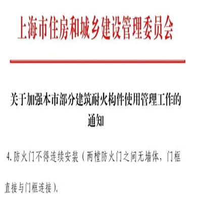 3.《耐火構(gòu)件通知》四:4.防火門不得連續(xù)安裝(兩樘防火門之間無墻體,門框直接與門框連接)