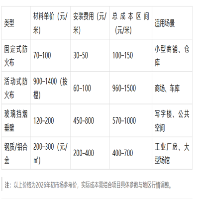 根據(jù)市場調(diào)研數(shù)據(jù),擋煙垂壁的安裝費用通常在 80元至800元/米 之間,部分復(fù)雜項目甚至更高。該價格受材質(zhì)、施工環(huán)境、地域差異及工程規(guī)模等多重因素影響,波動較大。需注意的是,擋煙垂壁多以“米”為計價單位(按長度計算),因其下垂高度一般固定(不小于500mm),長度直接決定工程量。